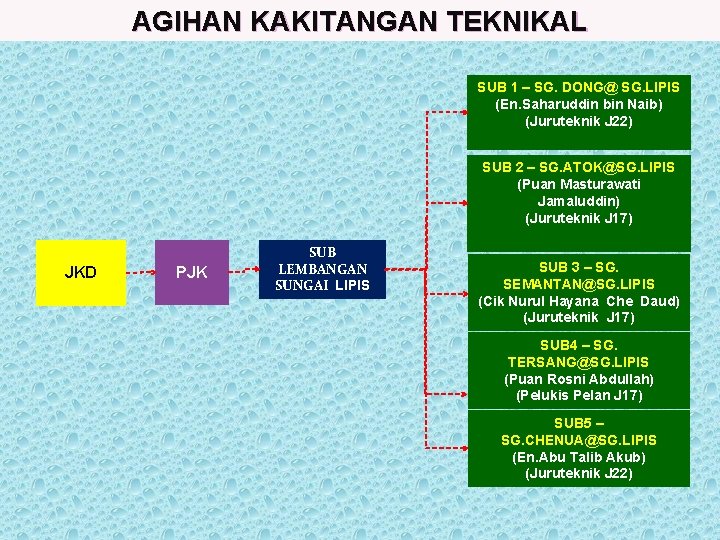 AGIHAN KAKITANGAN TEKNIKAL SUB 1 – SG. DONG@ SG. LIPIS (En. Saharuddin bin Naib) (Juruteknik J 22) SUB 2 – SG. ATOK@SG. LIPIS (Puan Masturawati Jamaluddin) (Juruteknik J 17) JKD PJK SUB LEMBANGAN SUNGAI LIPIS SUB 3 – SG. SEMANTAN@SG. LIPIS (Cik Nurul Hayana Che Daud) (Juruteknik J 17) SUB 4 – SG. TERSANG@SG. LIPIS (Puan Rosni Abdullah) (Pelukis Pelan J 17) SUB 5 – SG. CHENUA@SG. LIPIS (En. Abu Talib Akub) (Juruteknik J 22)