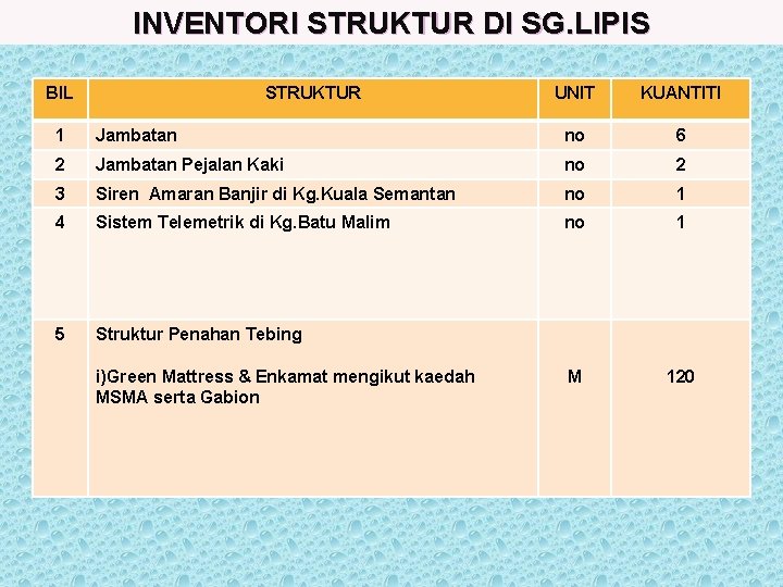 INVENTORI STRUKTUR DI SG. LIPIS BIL STRUKTUR UNIT KUANTITI 1 Jambatan no 6 2 Jambatan Pejalan Kaki no 2 3 Siren Amaran Banjir di Kg. Kuala Semantan no 1 4 Sistem Telemetrik di Kg. Batu Malim no 1 5 Struktur Penahan Tebing M 120 i)Green Mattress & Enkamat mengikut kaedah MSMA serta Gabion