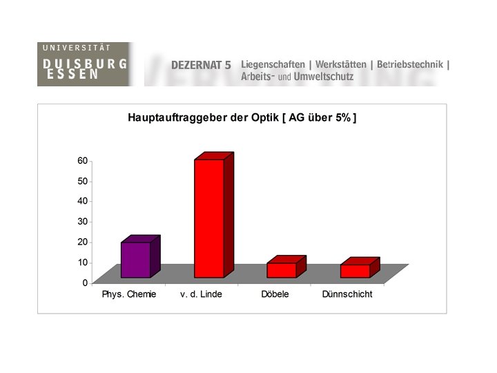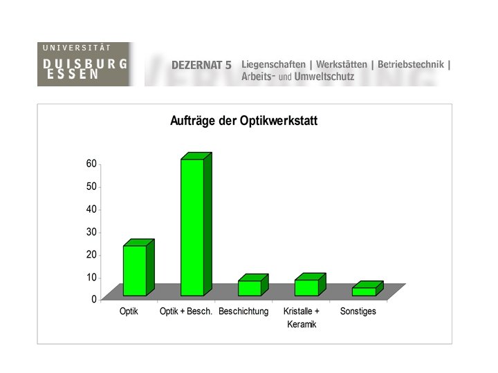 Inhalt der Präsentation • • Optikwerkstatt auf dem Campus Essen Wie ist die Werkstatt strukturiert? Was stellt die Werkstatt her? Wie sieht die Fertigung aus? Forschung Infrastrukturanforderungen Auftragsstatistik • Wie wird die Leistung der Optik durch die Fachbereiche Physik und Chemie wahrgenommen? • Planungsperspektiven