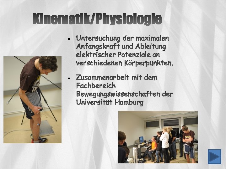 Wir untersuchen, wie Bewegungen durch das Nervensystem gesteuert werden Bewegungssteuerung ist Elektrizität. Wie funktioniert ein Nerv, wie löst er die Kontraktion eines Muskels aus? Hierzu untersuchen wir einfache Reflexe und messen später die Spannungsverhältnisse an einzelnen Muskeln bei komplizierteren Bewegungsabläufen.