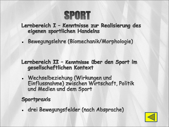 Leben und Bewegen Wir untersuchen Ökosysteme Wir experimentieren in einem biochemischen Labor Wir erarbeiten weitere Fachinhalte Wir experimentieren zu Ernährung und Stoffwechsel Wir stellen den Zusammenhang von Gesellschaft, Wirtschaft und Sport her Wir erarbeiten einen umfassenden Gesundheitsbegriff Wir beschäftigen uns mit Konfliktregelung in der Gesellschaft und zwischen Staaten Wir machen physiologische und kinematische Untersuchungen Wir kooperieren mit dem Naturschutzbund Deutschland Wir organisieren eine Podiumsdiskussion Wir untersuchen Bewegungen Wir entwickeln eine persönliche Position zur Gentechnik Wir untersuchen und erproben Wassersportarten Wir untersuchen menschliches und tierliches Lernen zurück Stundentafel Was nützt Dir das Profil Wann solltest Du das Profil Wählen Welche Fragen werden im Profil beantwortet Kooperationspartner