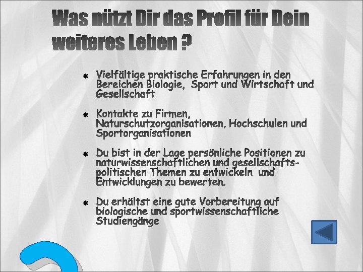 ? • Du hast Interesse an Biologie, Sport und PGW! • Du hast keine Angst vor chemischen Formeln! • Du experimentierst gerne! • Biomechanische und damit auch physikalische Herausforderungen schrecken dich nicht. • Du bewegst dich gern und stellst dich neuen sportlichen Anforderungen! • Du interessierst dich für die gesellschaftlichen und ökologischen Auswirkungen deiner Handlungen! • Du hast kein Problem mit grafischen Darstellungen. • Der Umgang mit einem PC macht dir keine Probleme!