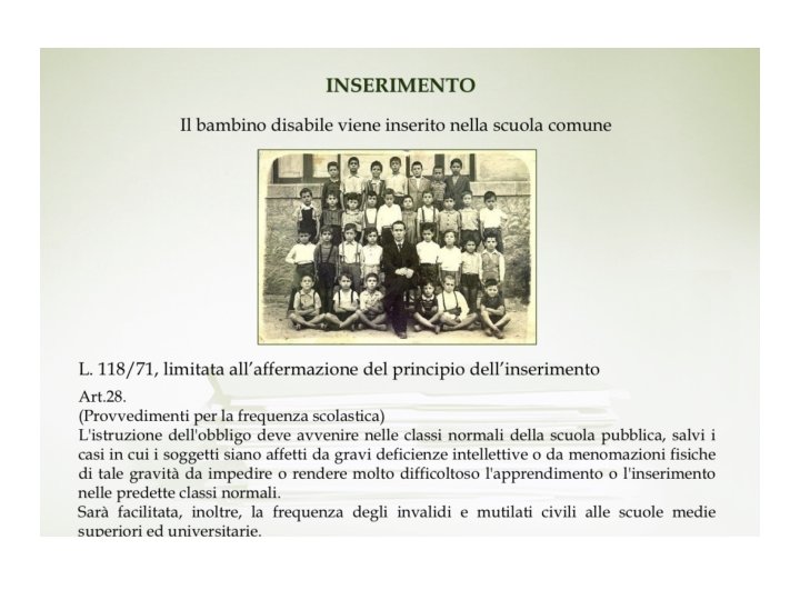 L’Italia fu la prima nazione al mondo a introdurre il diritto all’istruzione per le persone con disabilità nelle scuole ordinarie, e la prima a sviluppare un modello di integrazione scolastica rivolto agli alunni con disabilità, la cosiddetta “Via italiana all’integrazione”. legge n. 118 - 30 marzo 1971 Ha prefigurato il principio dell’abbattimento delle barriere architettoniche legge n. 517 - 4 agosto 1977 Ha sancito l’abolizione delle classi differenziali avviato forme di integrazione in favore degli alunni portatori di handicap, attraverso l’inserimento nelle classi normali sostenuto dalla presenza di insegnanti specializzati