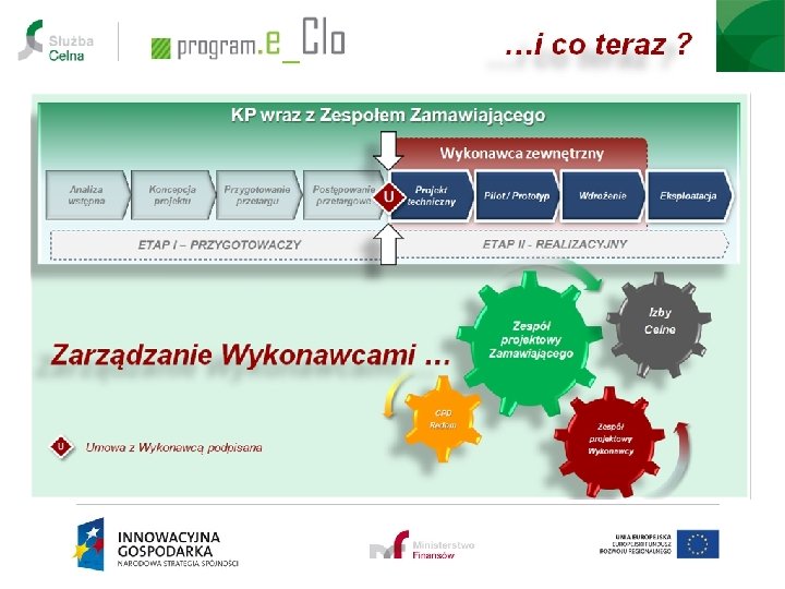 Kluczowe terminy obowiązujące w Programie q Podpisanie umów z Wykonawcami zewnętrznymi do końca 12. 2012 r. q Opracowane przez wykonawców zewnętrznych „Projekty Infrastruktury Technicznej” dostarczone do końca stycznia 2013 r. q Dostępna infrastruktura – czerwiec 2013 r. q Zakończenie projektu do końca 12. 2013 r. - osiągnięcie zaplanowanych wskaźników produktów Programu e-Cło q Pożądany/oczekiwany termin zakończenia Programu - osiągnięcie rezultatów, w tym stabilizacja – koniec 2014 r.