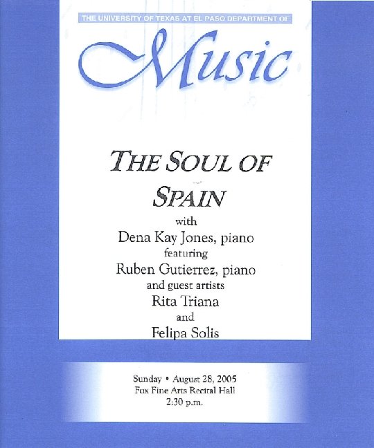 Mr. Gutierrez's professional career includes several levels of music production in El Paso recording studios and studios in Los Angeles, Chicago and Mexico City. He is a MIDI keyboard and tone module consultant and has performed, recorded and transcribed music for the Telarc International recording label. He has done production, sequencing, transcription, and performance/recording for local and regional companies including Miss Texas USA, Pepsi Cola, El Paso Natural Gas, El Paso Brass Quintet, Women's Missionary Union in Birmingham Alabama, the El Paso Symphony Orchestra, and the El Paso Brass Quintet. He also served for two years on the board of directors of the American Federation of Musicians, Local 466. In order to promote his efforts in commercial music, music technology and jazz piano as part of the UTEP music faculty, Mr. Gutierrez released a collection of his works in a C. D. entitled "Beveled Facets" with the Shade Records recording label featuring his Latin/Jazz piano style. The C. D. is being distributed nationally through Bayside Distribution and is available at Tower Records, Best Buy and Barnes and Noble stores all over the United States. He recently returned from a West Coast tour, lecturing on Latin jazz piano styles at University of Arizona in Tucson, Latin jazz history at Embry Riddle Academy and numerous radio interviews and performances, including the famed Los Angeles jazz club "The Baked Potato. " An East Coast performance/lecture series is being scheduled for the spring semester. Dancing since she could walk, Felipa Solis made her professional debut at the age of 10 in a program starring Placido Domingo. Her only teacher was her father, the legendary Spanish dancer and choreographer, Antonio Triana. Felipa has performed as soloist with the Triana Ballet Espanol in concert, and as guest artist with the FJ Paso Symphony Orchestra. The 2004 production of "Carmen, " marked her second appearance with the El Paso Opera in the role of the fiery gypsy dancer. Felipa cherishes her legacy and has created a unique dance style that reflects her energy, passion and heritage. A graduate of UTEP, she is an accomplished journalist and a well-known television news personality at KTSM-Newschannel 9. Married to Attorney Miguel Solis, she devotes much of her time to raising their 15 year-old son, Gabriel Antonio Triana was a dancer of mature artistry, dignity and power. His physical and technical dominion went far beyond what is known about Spanish Dance. His dance presented the summary of a national character, and in his choreography, he used his traditional Andalucian background for his brilliant inventions. He partnered the legendary La Argentina, Pilar Lopez and Carmen Amaya with spirit and gallantry. Over the years, he developed a very distinct method of teaching. Triana was the foremost Spanish-Flamenco dancer of his time. His wife, Rita, and their children, Antonio II and Felipa, are proud to have shared his genius. This recital is sponsored by Ivories on the Border and The University of Texas at El Paso Department of Music