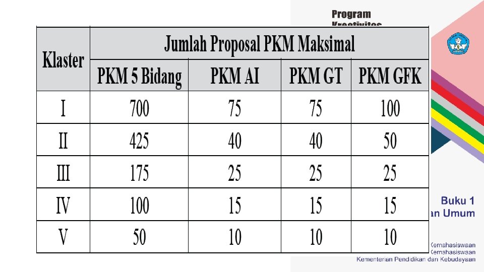 KONDISI KEKINIAN • Bahwa dirasa penting kiranya memperhatikan dan mengapresiasi usaha dan semangat PT se-Indonesia dalam mengajukan proposal PKM pendanaan 2020 (dengan jumlah sekitar 65 ribu proposal dari lebih dari 1000 PT se Indonesia) • Bahwa adanya pandemi Covid-19 menjadikan perlunya penyesuaian semua program kemahasiswaan nasional • Kegiatan kemahasiswaan penting difasilitasi di tengah masa pembatasan pandemi, terutama program sepenting PKM.