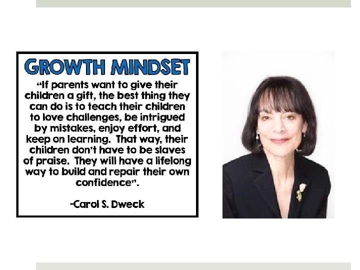 Dweck’s Cautions • Praising effort alone is not helpful if the child is not making progress – Praise the process and strategies the child used and tie those to the outcome – “See, you studied more and your grade on this test is higher. ” Or, “You tried different strategies and you figured out how to solve the problem. ” • Talking about growth mindsets is not enough, we need to alter our teaching and parenting strategies to align with the belief – How we respond to our children’s and our own failure or errors – Treat mistakes as learning opportunities and not as damaging or harmful