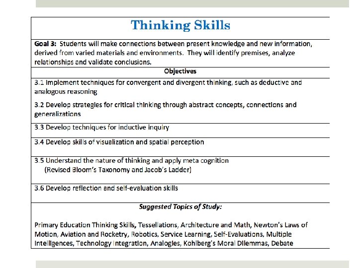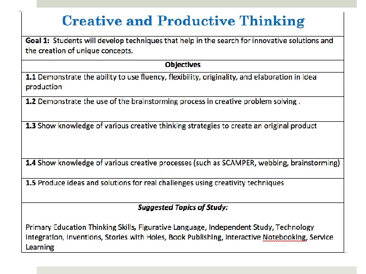 What are the Implications for my child? ? Curriculum ✓ AIG Resource classes do NOT instruct math or reading at an advanced level. ✓ Skills that will prepare gifted learners for a globally competitive world ✓ Develops career awareness ✓ Directly addresses the implication of being a gifted learner, as well as related social and emotional issues. AIG program encourages… ✓ ✓ ✓ ✓ ✓ A love of learning Creativity Innovativeness Goal setting Responsibility Time management Technology Social interaction Teamwork Career readiness