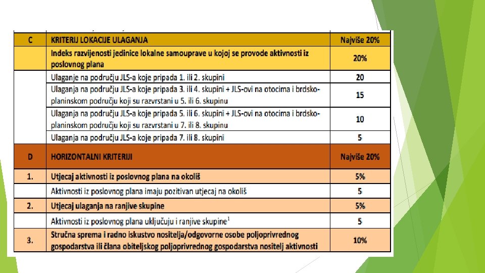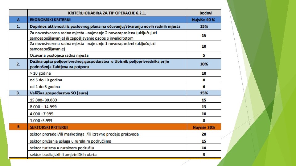 Prihvatljivi sektori 1. Sektor prerade i/ili marketinga i/ili izravne prodaje proizvoda 2. Sektor pružanja usluga u ruralnim područjima: a) usluge u poljoprivrednim, šumarskim i veterinarskim djelatnostima b) usluge u društvenim djelatnostima c) intelektualne usluge 3. Sektor turizma u ruralnom području 4. Sektor tradicijskih i umjetničkih obrta