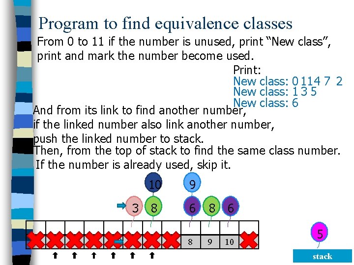 Program to find equivalence classes From 0 to 11 if the number is unused, print “New class”, print and mark the number become used. Print: New class: 0 11 4 7 2 And from its link to find another number, if the linked number also link another number, push the linked number to stack. Then, from the top of stack to find the same class number. If the number is already used, skip it. 1 10 3 11 5 0 1 2 3 4 9 2 3 8 4 6 8 6 0 5 6 7 8 9 10 11 7 11 stack