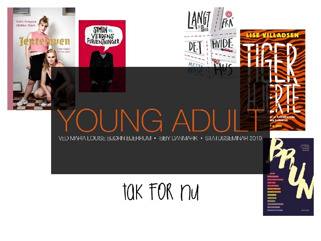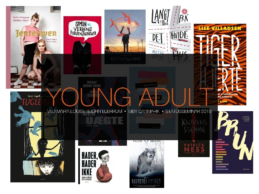 Young Adult 2018 • YA har fået et bredere publikum. De unge-voksne læser også YA i dag. Samtidig med at unge har travlt med at lægge barndommen bag sig, er der tilsyneladende ingen, der har travlt med at blive voksne. Anette Øster i Standart nr. 3 • Forfattere og illustratorer ikke tager et særligt hensyn til en ung YA-læser. • Behandler tematikker som mange aldersgrupper kan forholde sig til: livskriser, angst og depressioner, udfordringer i den moderne delefamilie og den mørke fremtid. • Leg med genre (genreblandinger).