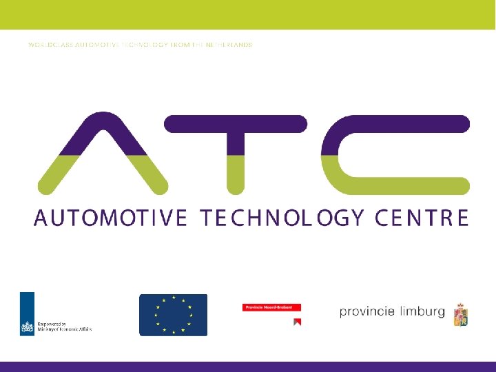 Aansluiting met het HTAS programma ATC focus in lijn met HTAS programma Product: Advanced Power trains Materials & Light Weight Constructions Design & Technology ICT, Infotainment, Intelligent Vehicles Proces: Manufacturing Technology & Logistics Driving Guidance: Connected Car Vehicle Dynamics Control Integrated HMI Vehicle Efficiency: Efficient Powertrain Light Constructions Enabling Program: Automotive Education Business Development Knowledge Transfer