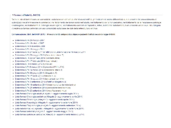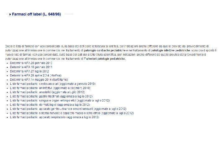 Liste di farmaci off label inseriti nella Legge 648/96 A partire dalla determinazione 29 maggio 2007 (G. U. n. 129 del 6/6/07), e, successivamente, con quella del 16 ottobre 2007 (G. U. n. 254 del 31/10/07) e 9 dicembre 2008 (G. U. n. 1 del 2/1/09), per finire con quella del 18 maggio 2011 (G. U. n. 118 del 23/05/11), nell’elenco della 648/96 è stata introdotta una nuova sezione per i farmaci impiegati off-label. In tale sezione sono riportate le liste di quei medicinali di uso consolidato, sulla base dei dati di letteratura, nel trattamento dei tumori solidi dell’adulto, nel trattamento dei tumori pediatrici, nel trattamento delle neoplasie e patologie ematologiche, nel trattamento di patologie Neurologiche, nel trattamento correlato ai trapianti, e, infine, radiofarmaci utilizzati per indicazioni, appunto, anche differenti da quelle previste dal provvedimento di AIC.