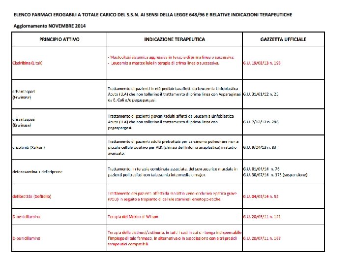 Come si ottiene l’inserimento? In pratica, l’autorizzazione è concessa dopo attenta valutazione della documentazione a supporto della richiesta di inserimento, che deve comprendere: • Una relazione di carattere scientifico sulla patologia che ne rappresenti la gravità e l’assenza di una valida alternativa terapeutica; • Il numero di soggetti interessati al trattamento (sul territorio nazionale) • Il completamento favorevole di studi clinici di fase 1 e 2 (per l’indicazione richiesta) • La descrizione del piano terapeutico proposto • L’ammontare previsto della spesa derivante dall’impiego proposto • Lo stato autorizzativo del medicinale in Italia ed all’ estero con indicazioni dell’azienda produttrice o fornitrice I medicinali vengono inseriti con specifica indicazione terapeutica, criteri di inclusione/esclusione; piano terapeutico, eventuali condizioni particolari relative a prezzo, fornitura, parametri per il monitoraggio clinico.