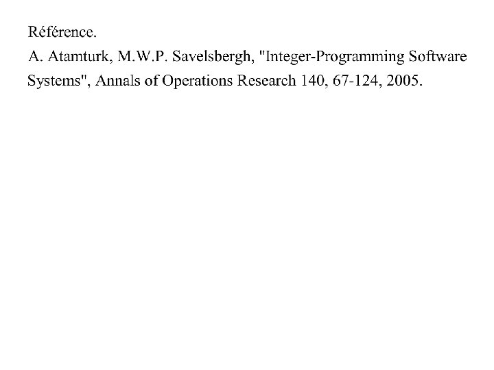 Méthodes de résolution • Principe de base Générer un ensemble de contraintes linéaires que nous ajoutons à (P) pour engendrer un nouveau problème (PR) tel que De plus en résolvant le problème relaxé , la solution optimale est entière et donc une solution optimale pour (P). • Exemple