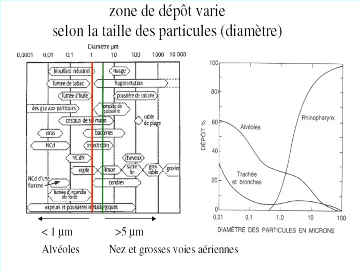 a) Les modalités de déposition des particules : La diffusion des particules se fait en fonction de leur diamètre : �< 1 μm : les particules se déposent au niveau des alvéoles : diffusion �> 5 μm : les particules se déposent tout au long de l’arbre bronchique.