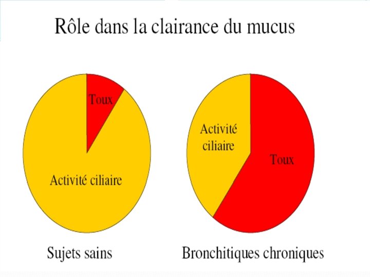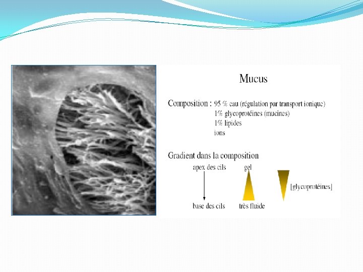 b)Les caractéristiques physico-chimiques du mucus : �Produit par les glandes sous-muqueuses +/- cellules caliciformes épithéliales �Forme un film continu de 5 à 10 mm d’épaisseur à la surface de l’épithélium respiratoire (voies aériennes supérieures aux bronchioles terminales) �Le mucus a une composition hétérogène : il y a une phase d’élasticité et de viscosité optimales pour le transfert muco-ciliaire. �Dans les bronchites chroniques le mucus est trop fluide.