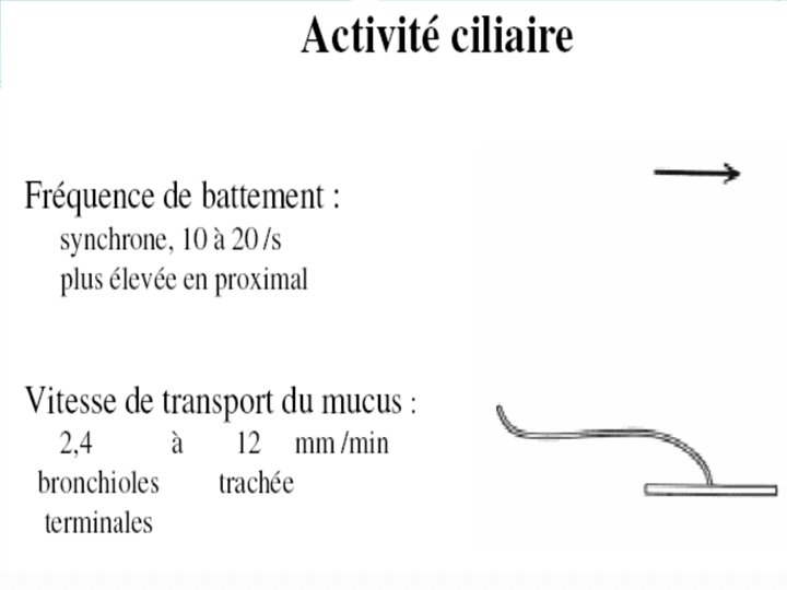 c) La dynamique ciliaire : �Les mouvements des cils sont propulsifs toujours vers le carrefour aéro-digestif. �La vitesse de battement des cils est plus lente dans les toutes petites voies aériennes et plus rapide dans la trachée et les grandes voies. �Normalement, les particules sont éliminées par déglutition ou par la toux �La déglutition se fait après une remontée de 3 à 24 heures selon le site de dépôt de la particule et selon le sujet.