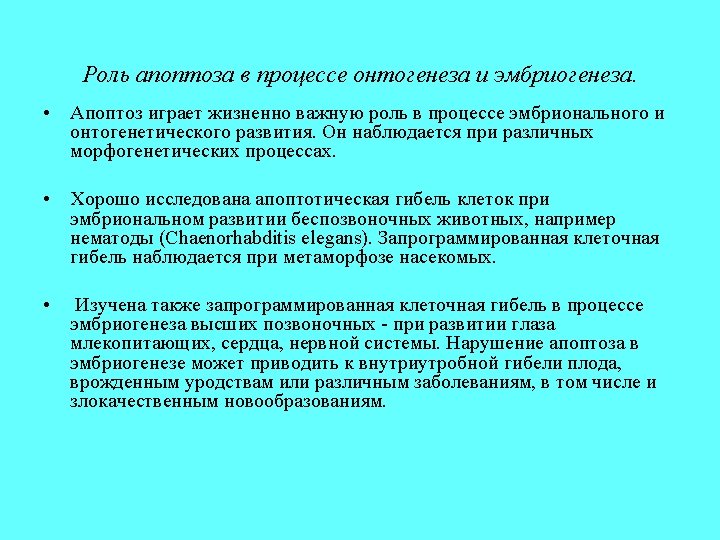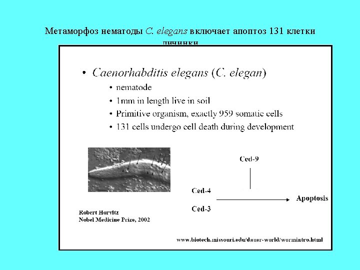Apoptosis and Development C. elegans -C. elegans have 1090 somatic cells - 131 cells die by apoptosis and 959 cells live and develop into tissues - 116 of the 131 dying cells are cells of the nervous system and ectoderm -The 2002 Nobel Prize in Physiology or Medicine was awarded to Brenner, Horvitz & Sulston for their work on apoptosis in C. elegans.