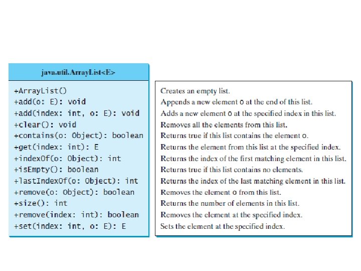 Array. List Constructors • T he Array. List class supports three constructors. Ø Array. List() : creates an empty array list with an initial capacity sufficient to hold 10 elements. Ø Array. List(int capacity) : creates an array list that has the specified initial capacity. Ø Array. List(Collection c) : creates an array list that is initialized with the elements of the collection c.