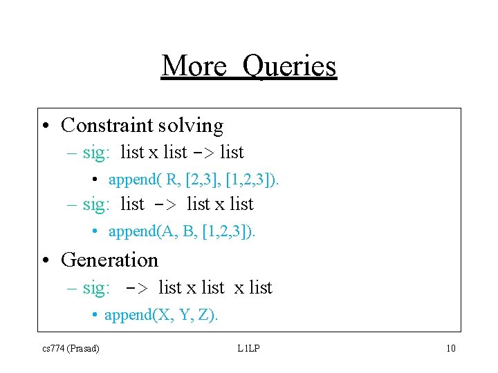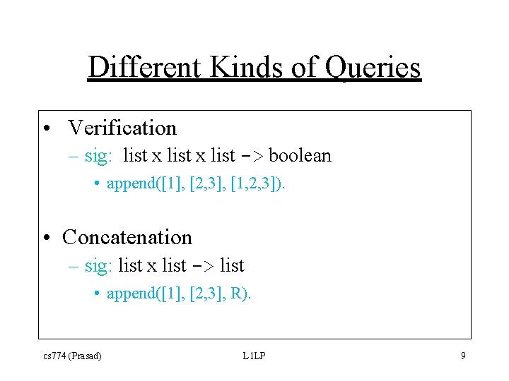 Different Kinds of Queries • Verification – sig: list x list -> boolean • append([1], [2, 3], [1, 2, 3]). • Concatenation – sig: list x list -> list • append([1], [2, 3], R). cs 774 (Prasad) L 1 LP 9