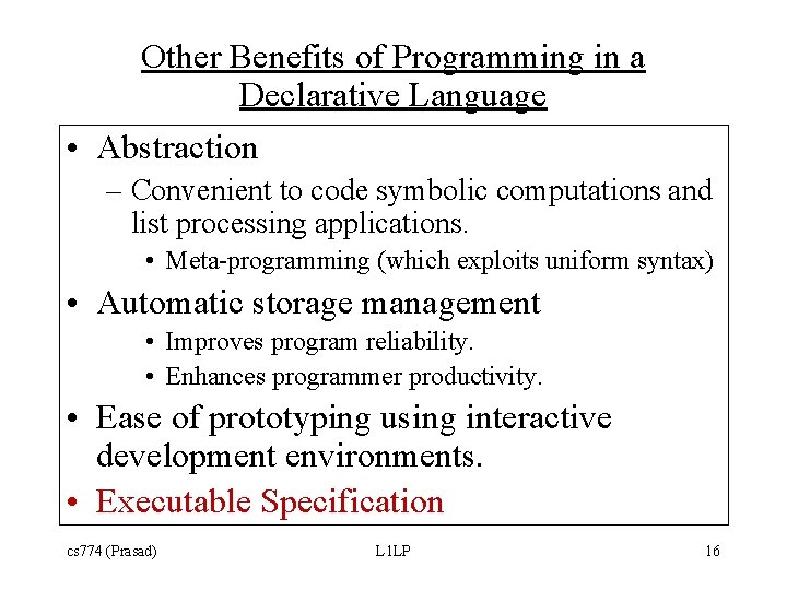 Other Benefits of Programming in a Declarative Language • Abstraction – Convenient to code symbolic computations and list processing applications. • Meta-programming (which exploits uniform syntax) • Automatic storage management • Improves program reliability. • Enhances programmer productivity. • Ease of prototyping using interactive development environments. • Executable Specification cs 774 (Prasad) L 1 LP 16