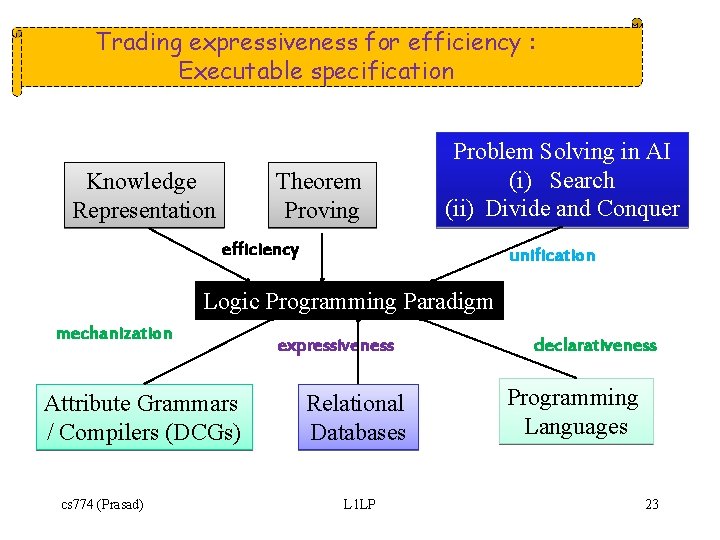 Trading expressiveness for efficiency : Executable specification Knowledge Representation Theorem Proving Problem Solving in AI (i) Search (ii) Divide and Conquer efficiency unification Logic Programming Paradigm mechanization Attribute Grammars / Compilers (DCGs) cs 774 (Prasad) expressiveness Relational Databases L 1 LP declarativeness Programming Languages 23