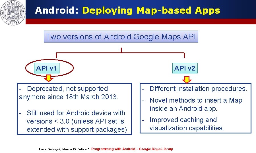 Android: Deploying Map-based Apps Two versions of Android Google Maps API v 1 API v 2 - Deprecated, not supported anymore since 18 th March 2013. - Still used for Android device with versions < 3. 0 (unless API set is extended with support packages) Luca Bedogni, Marco Di Felice - - Different installation procedures. - Novel methods to insert a Map inside an Android app. - Improved caching and visualization capabilities. Luca Bedogni Programming with Android (c) – Google Maps 2012 Library 6