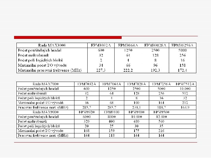 Mimo tyto existuje ještě mnoho dalších řad jako FLEX, které mají až 1. 500. 000 použitelných hradel, možnost zápisu do paměti RAM až 450. 00 bitů a počet makrobuněk až 3450. Mimo tohoto výrobce existují též další s podobnými obvody. Pro další vysvětlení použijeme obvod EPM 3064 A, který je na dalším obrázku. Tento obvod obsahuje : o 4 řídící bloky vstupů a výstupů o 4 logické bloky LAB o programově propojitelné pole PIA (Programmable Interconnect Array)