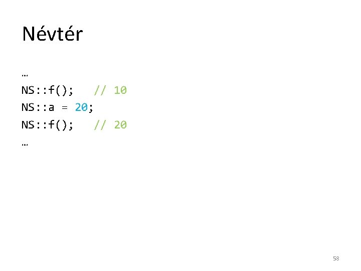 Névtér namespace NS { int a = 10; } namespace NS { void f() { std: : cout << a; } } 57
