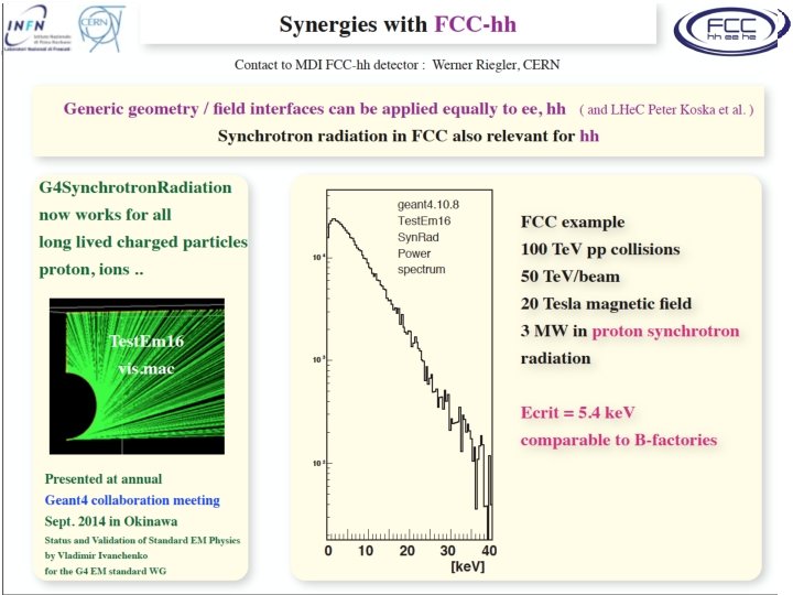 Spectrum Photon energy in units of the critical energy. x = Eγ / Ec For hom. field over formation length : single spectrum Geant 4 Test. Em 16 Photon spectrum weight with photon energy Power spectrum 10 Ge. V e+ moving initially in x-direction, bend downwards on a circular path by a 0. 1 T magnetic field in z-direction. Geant 4 Test. Em 16 This year : generalized to long live charged particle in Geant 4 10. 1 released 5/12/2014 Ref. : H. B. , CERN-OPEN-2007 -018, Geant 4 physics-manual Implemented as process G 4 Synchrotron. Radiation 5