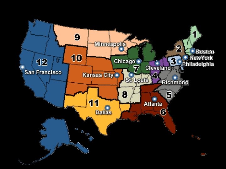 Federal Reserve Act • 1913 • Created a centralized banking system where banks can get loans in time of panic • Controls amount of money in circulation • 12 districts