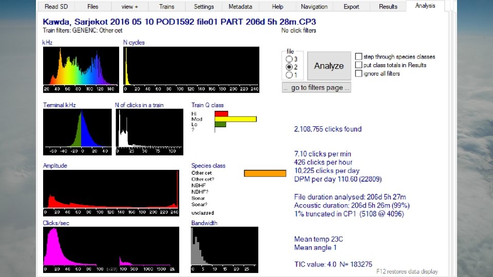 Decide on encounter classifier • KERNO - widely used for porpoise studies. Often gives low sensitivity for dolphins. • GENENC - often gives better ( x 2) sensitivity for dolphins and reduces false NBHF detections from dolphins at a cost of slightly reducing NBHF sensitivity. • Hel 1 - only detects porpoises. Assumes no dolphins occur, so it may give false positives from dolphins. Developed specifically for the Baltic using training data from the Hel Marine Station, Poland. • KERNO-F - under development. Uses F-POD data. Wide range of training data needed. Please give generously! • Choice based on validation of a sample of detections.