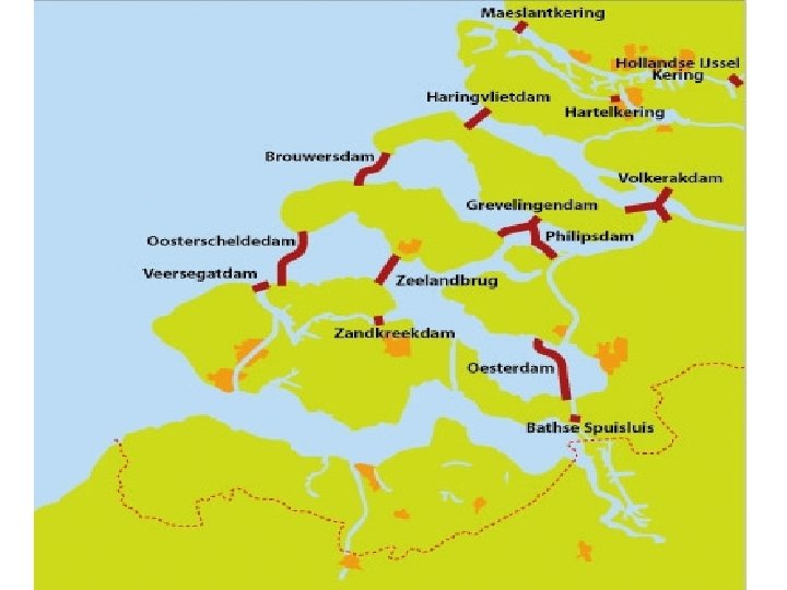 1. Vergelijk met de middeleeuwen (dia 6): de zee heeft teruggenomen wat hij had. 2. Deel van Zeeland ligt onder de zeespiegel 3. Dijken alleen dus niet genoeg