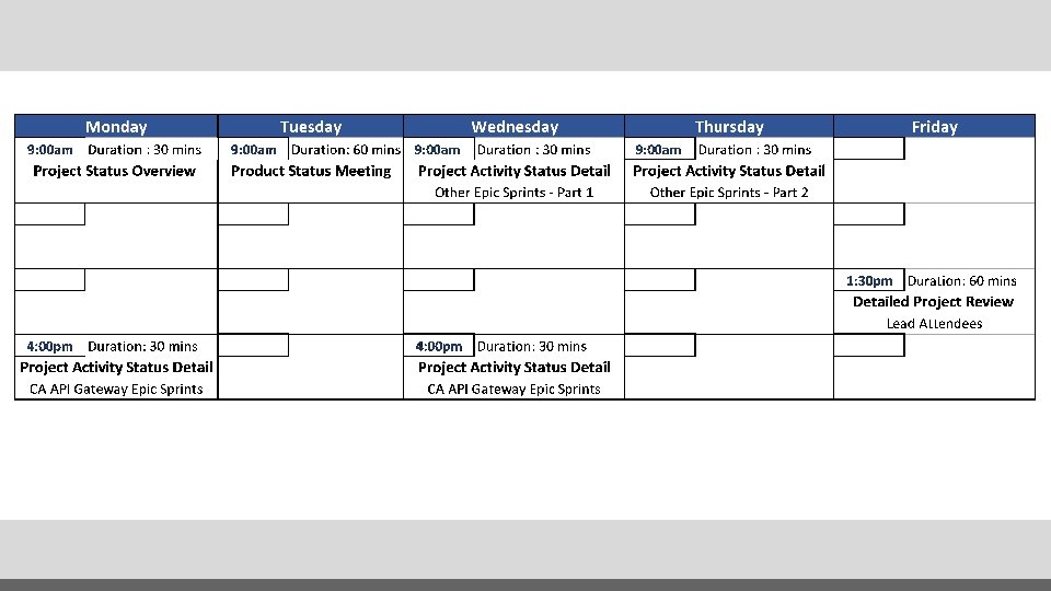 Project Meetings Structure and Governance (OLS Auth) An Important Element in the Project’s success is proper communication to Project team and key stakeholders. The primary objectives of these meetings are to ensure the Project is on track, Deliverables are Met and Milestones are achieved in the desired timeframe. Going forward the OLS Auth Weekly Project Meeting Cadence will consist of the following Structure: • Project Status Overview - High Level Status from PM with main focus on deliverables and dates. • Project Activity Status Detail - PM Led Sprint Planning and Sprint Review. There will be a Two week sprint iteration for each Epic. All Jira tasks relevant to each Epic for that particular Sprint will be reviewed. The responsibility will lie with the Task owner that each assigned task be updated with utmost detail. • Product Status Meeting – SPM Led meeting which covers Operation stability issues and risks. Also will introduce discussions on any special topics. • Detailed Project Review – PM led Status gathering sessions including setting Milestone