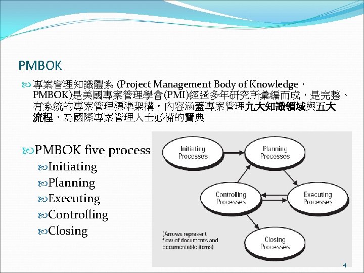 The PMBOK “Project Management Body of Knowledge” sum of knowledge within the profession of project management used to document and standardize generally accepted project management information and practices produced by the Project Management Institute revised and reprinted every 4 years – fourth edition is expected to be released shortly 53