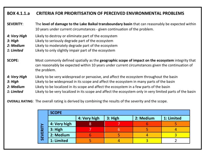 TRANSBOUNDARY DIAGNOSTIC ANALYSIS LAKE BAIKAL BASIN WHY PRIORITISE? • Environmental issues in transboundary water basins are often abundant and complex, while financial and human resources are limited • Prioritisation enables governments and other stakeholders to focus limited financial and human resources on key environmental issues and maximise impact