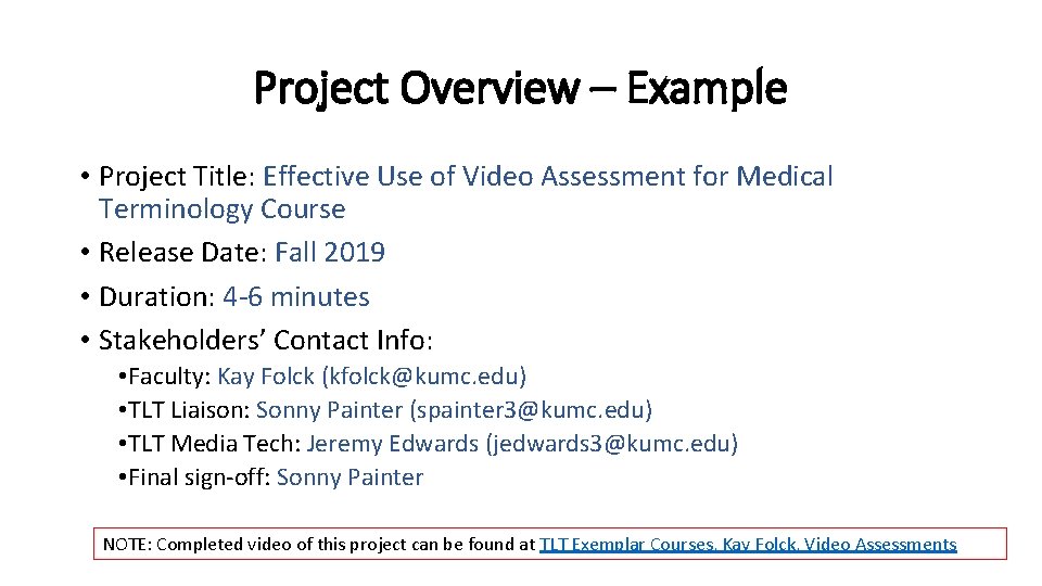 Project Overview – Example • Project Title: Effective Use of Video Assessment for Medical Terminology Course • Release Date: Fall 2019 • Duration: 4 -6 minutes • Stakeholders’ Contact Info: • Faculty: Kay Folck (kfolck@kumc. edu) • TLT Liaison: Sonny Painter (spainter 3@kumc. edu) • TLT Media Tech: Jeremy Edwards (jedwards 3@kumc. edu) • Final sign-off: Sonny Painter NOTE: Completed video of this project can be found at TLT Exemplar Courses, Kay Folck, Video Assessments