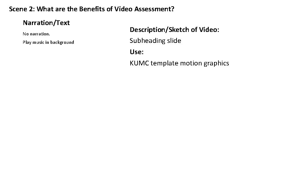 Scene 2: What are the Benefits of Video Assessment? Narration/Text No narration. Play music in background Description/Sketch of Video: Subheading slide Use: KUMC template motion graphics