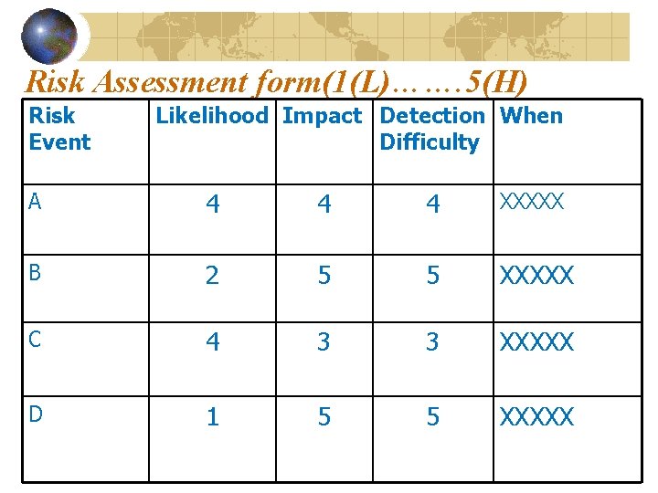 Risk Assessment form(1(L)……. 5(H) Risk Event Likelihood Impact Detection When Difficulty A 4 4 4 XXXXX B 2 5 5 XXXXX C 4 3 3 XXXXX D 1 5 5 XXXXX