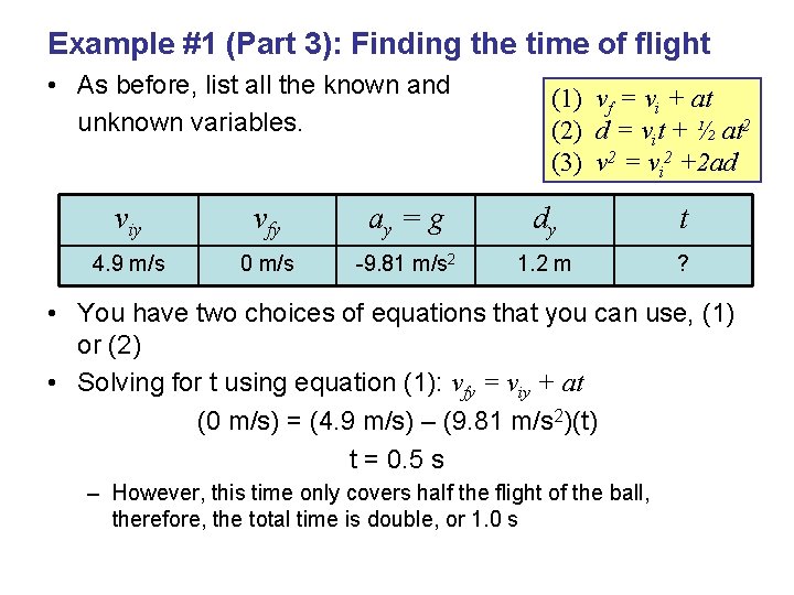 Example #1 (Part 3): Finding the time of flight • As before, list all the known and unknown variables. (1) vf = vi + at (2) d = vit + ½ at 2 (3) v 2 = vi 2 +2 ad viy vfy ay = g dy t 4. 9 m/s 0 m/s -9. 81 m/s 2 1. 2 m ? • You have two choices of equations that you can use, (1) or (2) • Solving for t using equation (1): vfy = viy + at (0 m/s) = (4. 9 m/s) – (9. 81 m/s 2)(t) t = 0. 5 s – However, this time only covers half the flight of the ball, therefore, the total time is double, or 1. 0 s