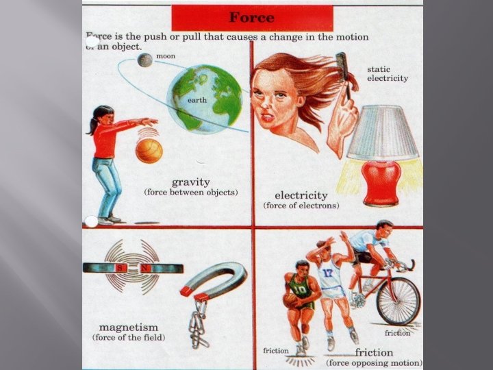 What is this unbalanced force that acts on an object in motion? There are four main types of friction: Sliding friction: ice skating Rolling friction: bowling Fluid friction (air or liquid): air or water resistance Static friction: initial friction when moving an object