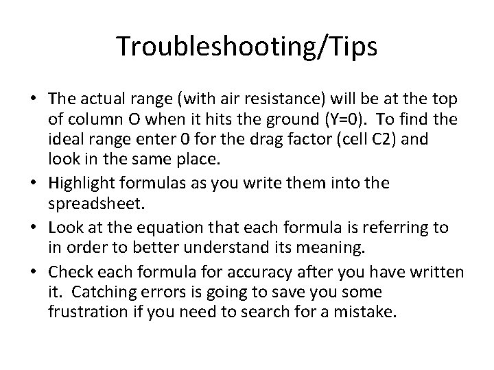Troubleshooting/Tips • The actual range (with air resistance) will be at the top of column O when it hits the ground (Y=0). To find the ideal range enter 0 for the drag factor (cell C 2) and look in the same place. • Highlight formulas as you write them into the spreadsheet. • Look at the equation that each formula is referring to in order to better understand its meaning. • Check each formula for accuracy after you have written it. Catching errors is going to save you some frustration if you need to search for a mistake.
