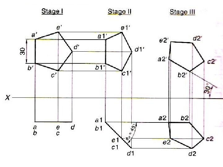 Illustration no. 3 A regular pentagon ABCDE of side 30 mm has one of its edges parallel to VP and inclined at 30° to the HP. The pentagon is inclined at 45° to the VP. Draw the projections.