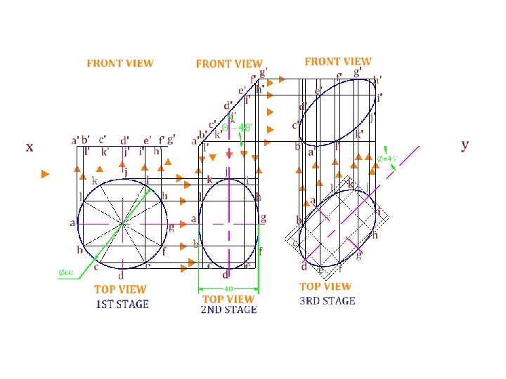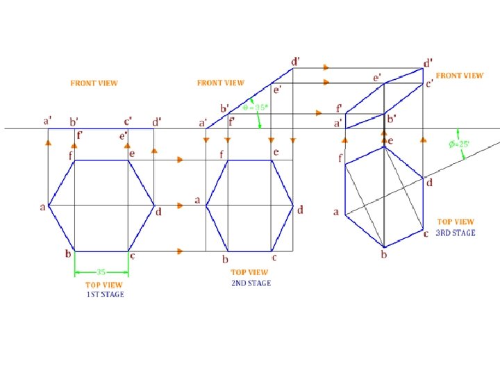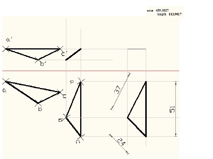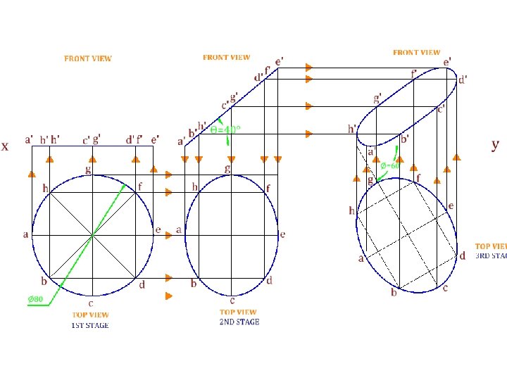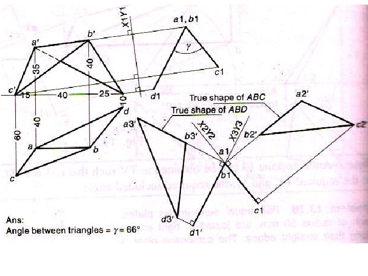 Illustration no. 7 The FVs and TVs of two triangle planes (ABC & ABD) as given bellows, find the true angle between them A(15, 20, 95) B(55, 20, 100) C(00, 60) D(80, 50, 60)