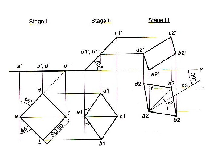 Illustration no. 2 A square lamina of 50 mm side rests on one of the corners on the HP. The diagonal through that corner makes 30° to VP. The two sides containing this corner make equal inclinations with the HP. The surface of the lamina makes 45° to the HP. Draw the TV and FV of lamina.