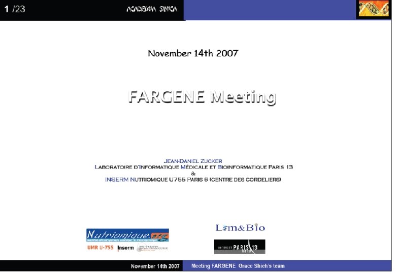 Acknowledgement Dr. Hung Li and Wen-Cheng Chen, Inst. Molecular Biol. , A. S. Drs. Cheng-Fu Kao ans Yi-Cheng Lo, Inst. Cellular & Organismic Biology, A. S. Dr. Chiou-Hua Yuh, Molecular & Genome Medicine, NHRI Dr. Jean-Daniel Zucker and Ramzi Temanni, INSERM, Paris VI & Paris XIII Univ, France Dr. Ting-Fang Wang and Da-Yow Huang, Inst. of Biological Chemistry, A. S. Cheng-Long Chuang, Chin-Yuan Guo, Dr. Shi-Fong Guo, Dr. Shang-Kai Tai, Chia-Chang Wang, Yu-Bin Wang Inst. of Statistical Science, A. S.