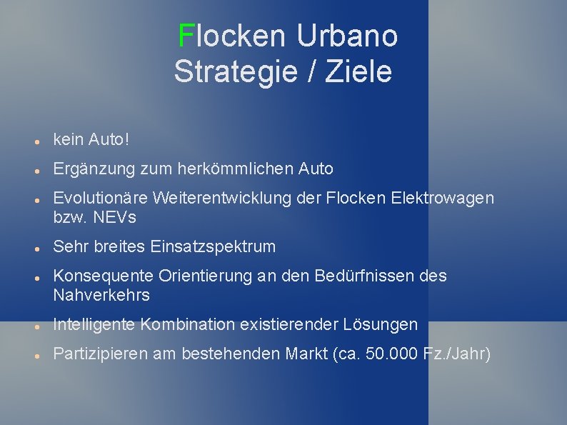 Flocken Urbano Strategie / Ziele kein Auto! Ergänzung zum herkömmlichen Auto Evolutionäre Weiterentwicklung der Flocken Elektrowagen bzw. NEVs Sehr breites Einsatzspektrum Konsequente Orientierung an den Bedürfnissen des Nahverkehrs Intelligente Kombination existierender Lösungen Partizipieren am bestehenden Markt (ca. 50. 000 Fz. /Jahr)