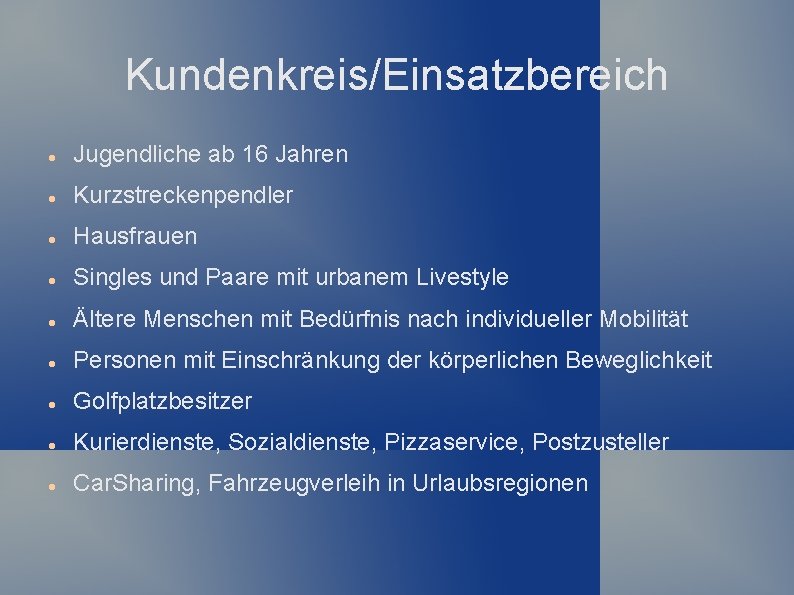 Kundenkreis/Einsatzbereich Jugendliche ab 16 Jahren Kurzstreckenpendler Hausfrauen Singles und Paare mit urbanem Livestyle Ältere Menschen mit Bedürfnis nach individueller Mobilität Personen mit Einschränkung der körperlichen Beweglichkeit Golfplatzbesitzer Kurierdienste, Sozialdienste, Pizzaservice, Postzusteller Car. Sharing, Fahrzeugverleih in Urlaubsregionen