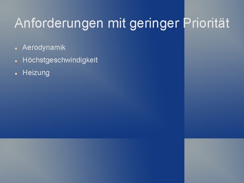 Anforderungen mit geringer Priorität Aerodynamik Höchstgeschwindigkeit Heizung